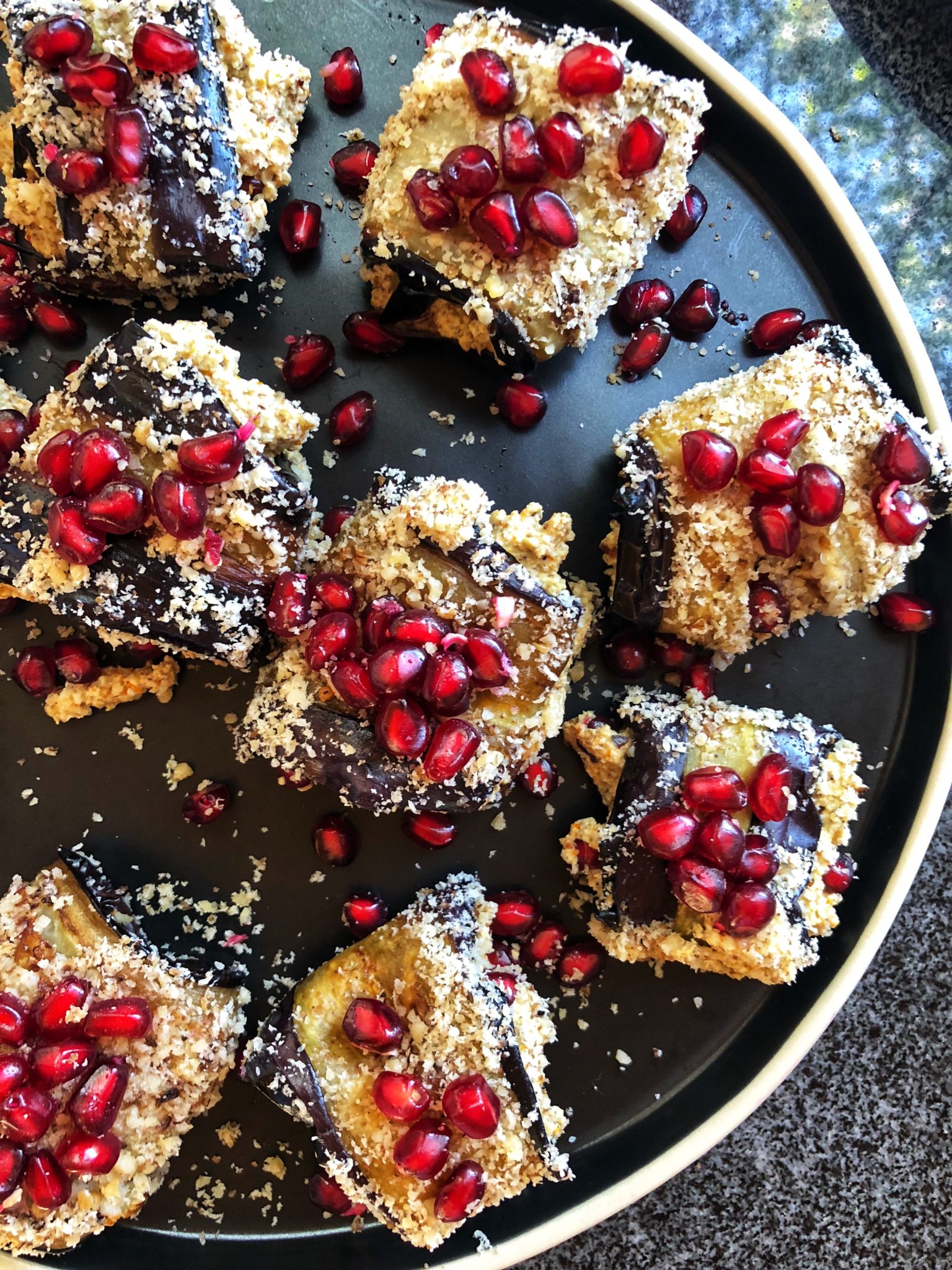 Walnut pastes and salads are often served as appetizers. Pkhali are chopped salads that are pureed vegetables, mixed with garlic, herbs and walnuts. They are typically served atop pieces of bread and can be a variety of veggies, but beets, carrots or spinach are most popular. Badrijani is another famous and delicious walnut centered starter. These are rolled and fried slices of eggplant filled with a walnut and herb paste and finished with pomegranate seeds sprinkled on top.
